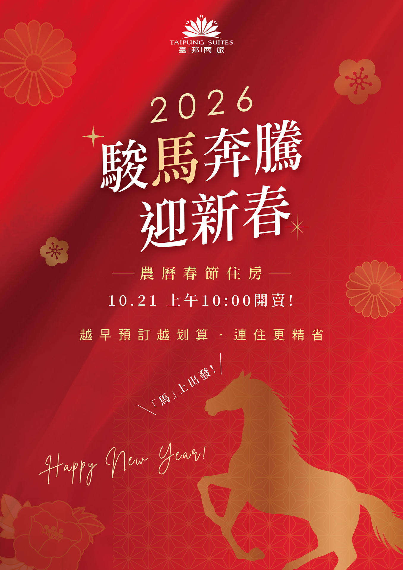 2026 「駿馬啟程。農曆春節住房專案」 無論是返鄉團聚或假期度假,一起「馬」上出發,迎接嶄新氣象!販售日期|2025/10/21(二) 上午10:00起適用期間|2026/02/14-2026/02/21優惠內容|越早預訂越划算,連續住宿享更多優惠專屬好康|2026/02/16-2026/02/20日期間入住,每筆訂單每房加贈「精美好禮」乙份 線上訂房|https://reurl.cc/g6jznL訂房專線|06-2931888